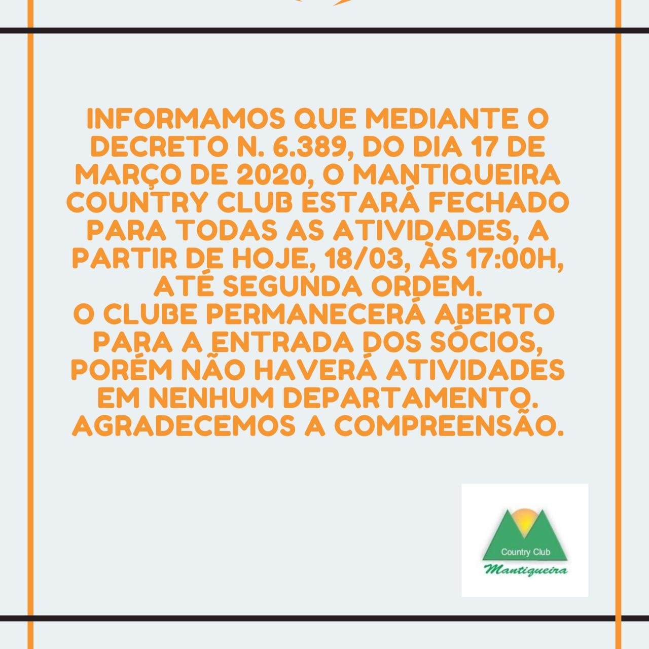 Comunicado – Atividades no clube Mantiqueira Country Clube2020-03-20T20:46:21-03:0018 de março de 2020|Categories: Informativo|0 Comentários Compartilhe! FacebookXWhatsAppE-mail Postagens Relacionadas Seja Amigo do Meio Ambiente: Diga Não aos Copos Plásticos! 12 de setembro de 2024 | 0 Comentários Estreia da Nova Academia 12 de setembro de 2024 | 0 Comentários Nova grade das aulas de tênis 11 de fevereiro de 2024 | 0 Comentários Alterações no horário de funcionamento no dia 10/06 6 de junho de 2023 | 0 Comentários Deixar um comentário Cancelar respostaComentário Δ